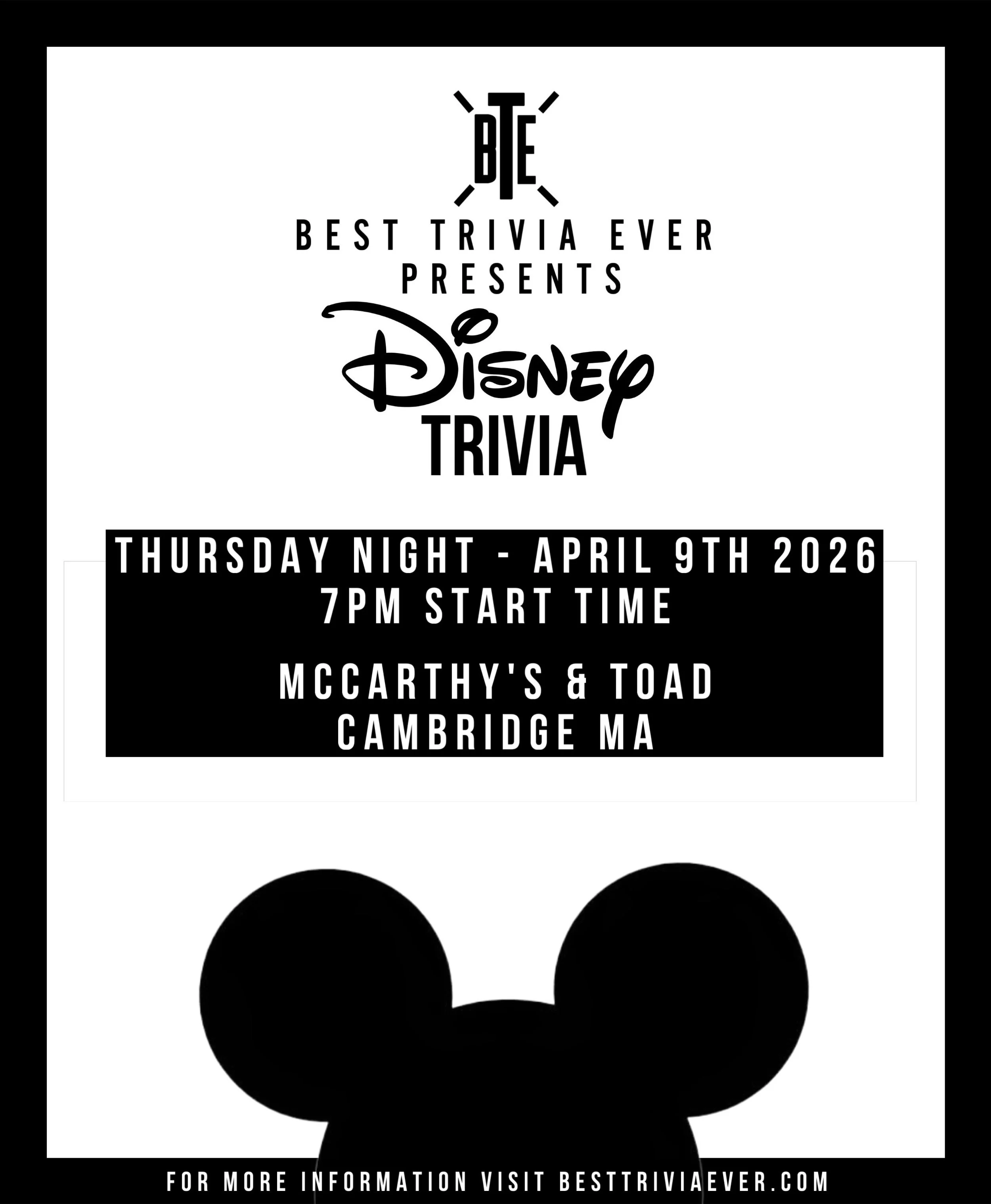 UPSTAIRS: Best Trivia Ever Night - 'Disnep Trivia’ Thursday, April 9, 2026 7:00 PM 9:00 PM Google Calendar ICS
