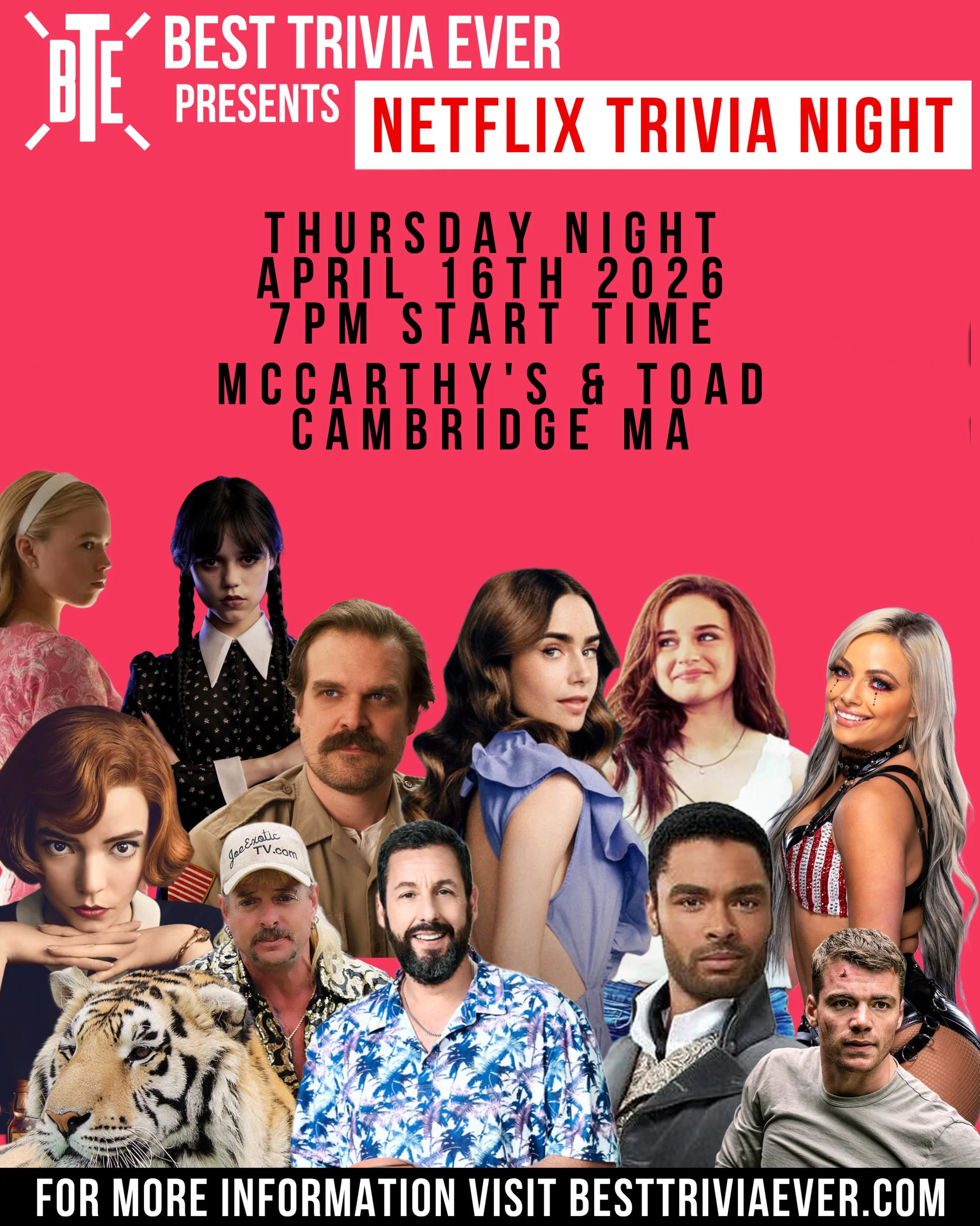 Back to All Events UPSTAIRS: Best Trivia Ever Night - 'Netflix Trivia Night’ Thursday, April 16, 2026 7:00 PM 9:00 PM Google Calendar ICS
